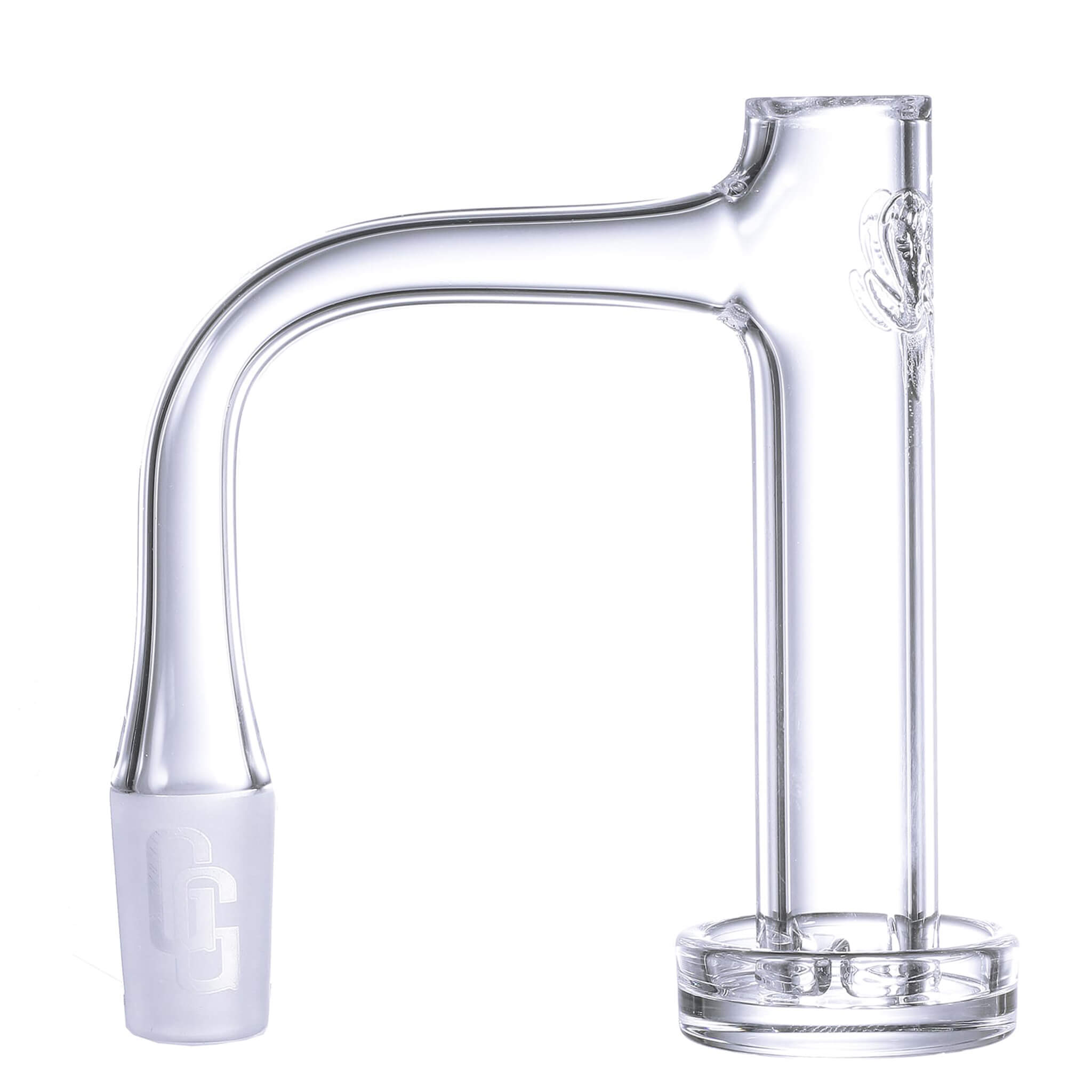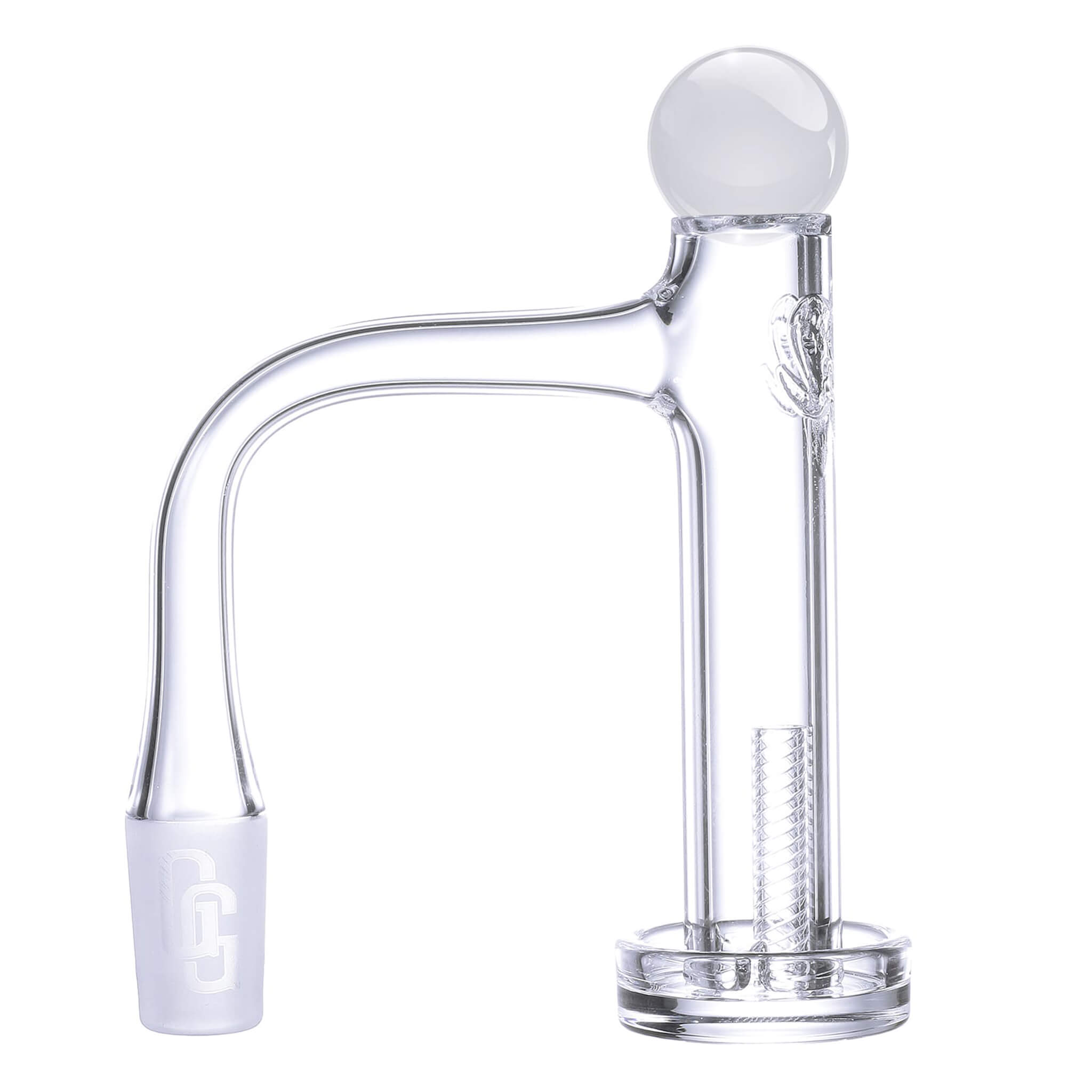 Enjoy this high-quality quartz banger dabbing kit, featuring unmatched styling and design components. It features a frosted, branded "GG" logo-laden joint, a high airflow fully welded neck, engraved styling, the Golden Goat logo, a fun, clear high-quality tower marble, and one large, ribbed quartz pillar, for your pleasure! Three aggressive directional air slits surround the tray to rotate and lift the quartz pillar while frothing your terps. This Control Tower Banger is a fan favorite due to its limitless quartz runway, allowing you to vaporize all your wax, far from the fully welded neck. No loss. Your purchase comes in a deep, laser-cut foam-filled pad, making it an excellent mobile case for on-the-go use.